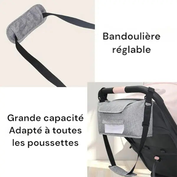 - S’adapte à tous les modèles de poussettes grâce à ses sangles réglables
